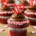 Delight in these classic Red Velvet Cupcakes topped with a rich Chocolate Cream Cheese Frosting and decorated with charming red candy heart toppers. Perfectly moist and tender cupcakes with a vibrant red hue balance the subtle cocoa flavor, complemented by smooth, indulgent frosting. Ideal for celebrations or any sweet craving.
