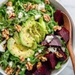 This vibrant Roasted Beet & Goat Cheese Salad combines tender roasted beets with peppery arugula, creamy avocado, tangy goat cheese, and crunchy toasted walnuts. Tossed in a homemade balsamic vinaigrette with a hint of maple syrup and Dijon mustard, this salad is a perfect balance of earthy, sweet, and savory flavors, ideal for a nutritious lunch or a light dinner.