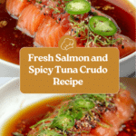A refreshing and elegant Salmon and Tuna Crudo recipe featuring sushi-grade fish marinated in a tangy yuzu-tamari sauce, paired with a spicy tuna mix, crisp scallions, and a drizzle of flavorful salsa macha. Perfect for a light appetizer or sophisticated starter.