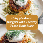 These Salmon Burgers with Slaw offer a delicious and healthy twist on the classic burger. Made with cooked salmon, fresh herbs, and perfectly seasoned, these pan-fried patties are crispy on the outside and tender inside. Served with a creamy, tangy cabbage slaw made with Greek yogurt and fresh herbs, this recipe is a refreshing and satisfying meal perfect for lunch or dinner.