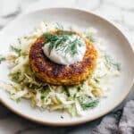 These Salmon Burgers with Slaw offer a delicious and healthy twist on the classic burger. Made with cooked salmon, fresh herbs, and perfectly seasoned, these pan-fried patties are crispy on the outside and tender inside. Served with a creamy, tangy cabbage slaw made with Greek yogurt and fresh herbs, this recipe is a refreshing and satisfying meal perfect for lunch or dinner.