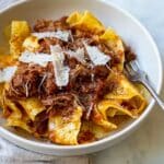 Store leftover ragu in an airtight container in the refrigerator for up to 3 days. It also freezes well for up to 3 months—defrost overnight in the fridge before reheating. Reheat gently on the stovetop or microwave until piping hot, adding a splash of water if needed to loosen the sauce.
