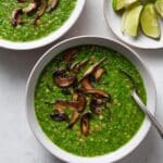 A top view of two white bowls filled with thick green soup that has visible grains of rice and lentils mixed in. Each bowl is topped with several slices of cooked shiitake mushrooms that have a brown, slightly crispy look. One bowl has a silver spoon lowered inside, partially submerged in the soup. Nearby, there is a small white dish holding lime wedges, placed on a white marbled surface. The scene has bright, natural lighting. photo taken with an iphone --ar 4:5 --v 7