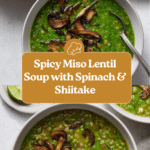 This Spicy Miso Lentil Soup combines hearty lentils and rice with a vibrant, spicy miso and spinach puree. Enhanced by browned shiitake mushrooms and a kick of fresh serrano chiles, this comforting soup is perfect for a nourishing and flavorful meal with Asian-inspired flair.