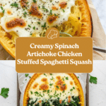Keywords: spaghetti squash, spinach artichoke chicken, low-carb dinner, healthy spaghetti squash recipe, creamy chicken pasta alternative