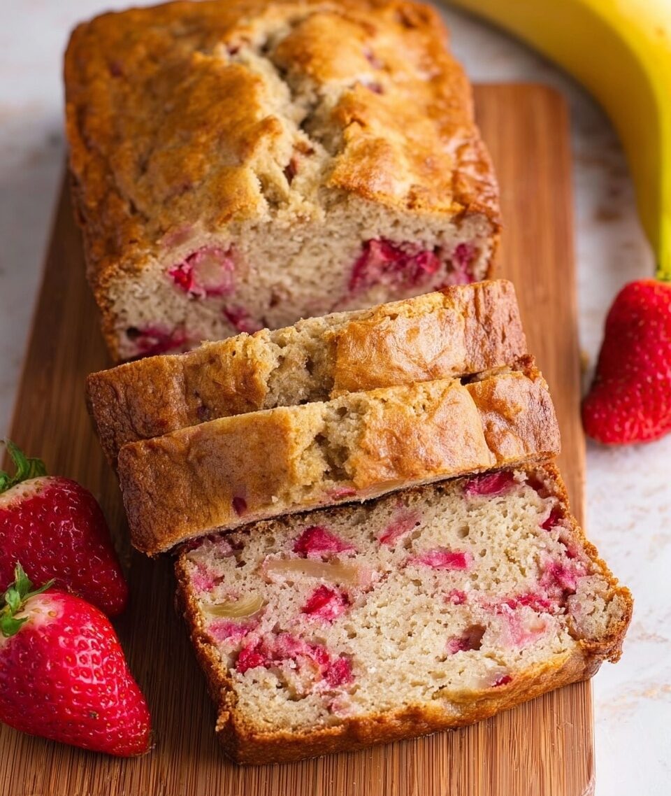 A delightful and moist Strawberry Banana Bread featuring ripe mashed bananas and fresh chopped strawberries. This quick bread combines the sweet flavors of fruit with a tender crumb, perfect for breakfast or an afternoon snack.