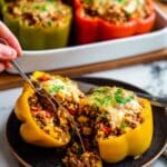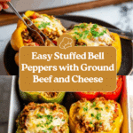 Keywords: stuffed bell peppers, ground beef recipe, baked stuffed peppers, rice stuffed peppers, comfort food, easy dinner