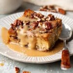 9. Step 9: Slice the bread pudding into wedges and serve warm or at room temperature. Reheat the sauce as needed if it thickens. Top with vanilla ice cream, whipped cream, and chopped pecans if desired. Enjoy!