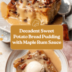 This comforting and decadent Sweet Potato Bread Pudding with Maple Rum Sauce combines soft cubes of day-old French bread soaked in a spiced sweet potato custard, baked to golden perfection, and served with a luscious maple rum sauce. Perfect for cozy gatherings or holiday brunch, it’s a warm, indulgent dessert that pairs beautifully with vanilla ice cream or whipped cream and crunchy pecans.