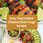Thai Grilled Chicken (Gai Yang) features juicy, flavorful chicken thigh fillets marinated in a fragrant blend of lemongrass, garlic, fish sauce, and soy sauces. This authentic Thai recipe is traditionally grilled to achieve a caramelized exterior while maintaining tender and juicy meat. Served with coconut rice, lime wedges, fresh chilies, coriander, and a tangy nam jim jaew dipping sauce or sweet chili sauce, this dish offers a perfect balance of smoky, savory, sweet, and zesty flavors.