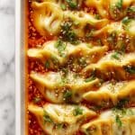 This Thai Red Curry Dumpling Bake combines the comforting flavors of frozen pork dumplings with a rich, aromatic Thai red curry sauce made from coconut milk, fresh ginger, garlic, and vibrant spices. Baked until bubbly and golden-tipped, the dish is garnished with green onions, toasted sesame seeds, and a drizzle of chili oil, served over steamed jasmine rice for a hearty and flavorful meal perfect for weeknight dinners.