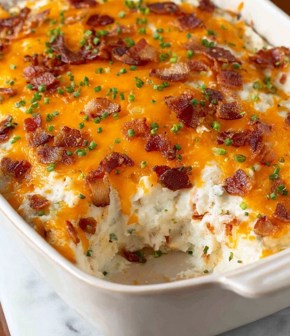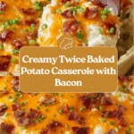 This Twice Baked Potato Casserole is a comforting and creamy side dish featuring mashed potatoes blended with butter, cream cheese, sour cream, and cheddar cheese, topped with crispy bacon and green onions, then baked to bubbly perfection. It’s perfect for holiday dinners or family gatherings.