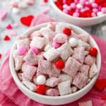 - Mix Together with M&Ms: Combine the two varieties of puppy chow in a large bowl and mix in 1 cup of white, pink, and red M&Ms for a colorful and festive finish.
