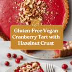 A delicious vegan and gluten-free cranberry tart featuring a crisp hazelnut-date crust and a velvety coconut cream cranberry filling. This tart balances tart cranberries with sweetened coconut cream, making it a perfect festive dessert for holiday gatherings or any special occasion.