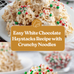 White Chocolate Haystacks are a delicious and easy no-bake treat combining the creamy sweetness of melted white almond bark with the crispy crunch of chow mein noodles and roasted peanuts, all topped with colorful nonpareils for a festive touch. Perfect for quick holiday treats or anytime you want a simple, crunchy, sweet snack.