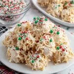 White Chocolate Haystacks are a delicious and easy no-bake treat combining the creamy sweetness of melted white almond bark with the crispy crunch of chow mein noodles and roasted peanuts, all topped with colorful nonpareils for a festive touch. Perfect for quick holiday treats or anytime you want a simple, crunchy, sweet snack.