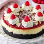 Keywords: white chocolate cheesecake, raspberry cheesecake, Oreo crust, baked cheesecake, creamy dessert